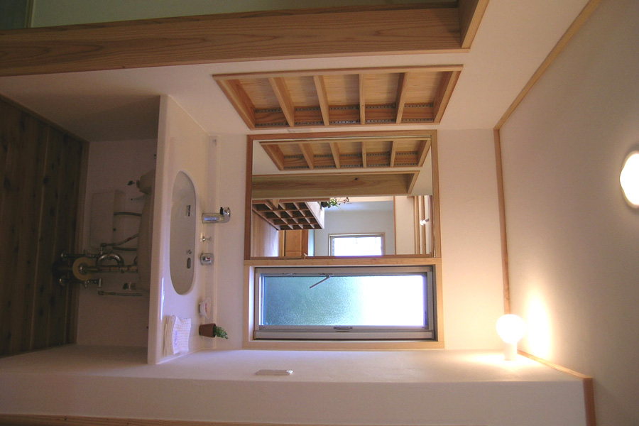 オーガニック志向の建主さん。石油化学製品を極力抑え、漆喰・杉など自然素材で仕上げました。中2階に設けたワークスペースは1階と2階を緩やかに繋ぎます。共働きのご夫婦のために家事動線を最短にし、スムーズに料理・洗濯が出来ます。