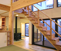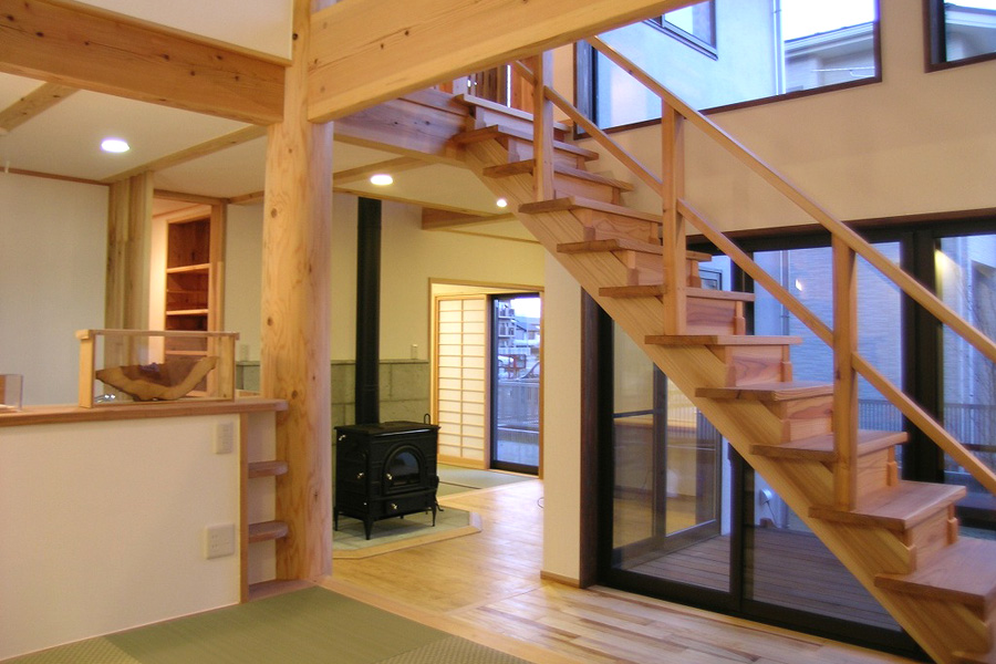 コの字で中庭を囲んだ大屋根の住宅。40坪程度でこれをバランスよく実現させるのは難しいのですが、カーポート、ポーチ庇も取り込んでトータルにデザインしてあります。中庭吹き抜けに沿って階段を配置し、中庭と建物が一体となり、広がりのある間取りとなっています。
